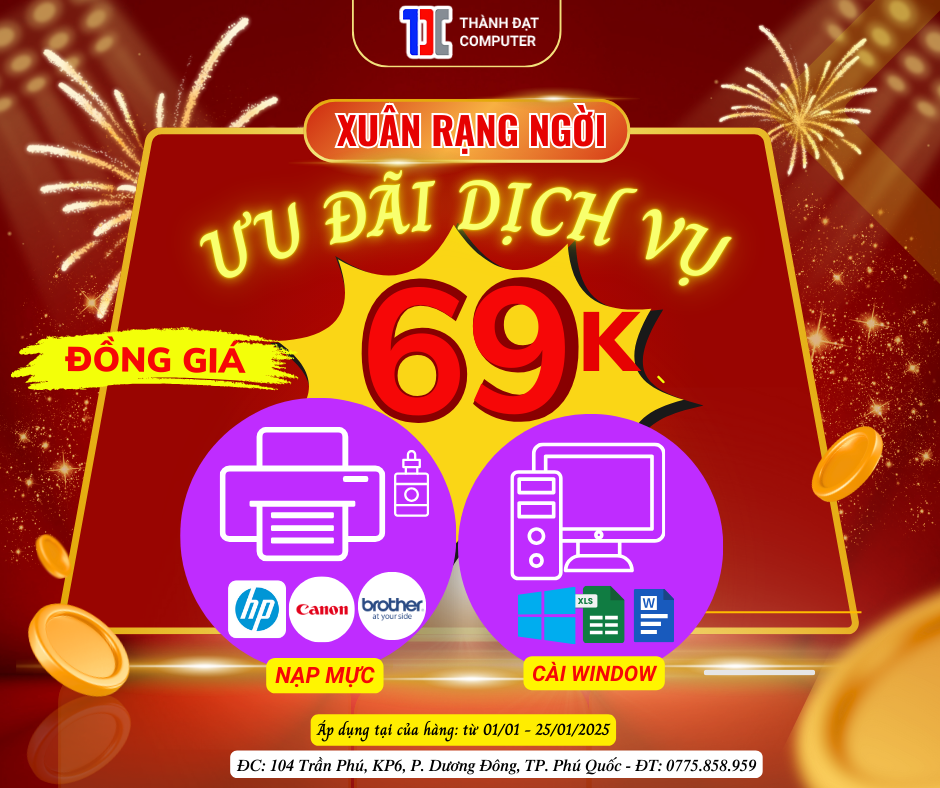 Ưu đãi dịch vụ đồng giá 69k là chương trình khuyến mãi cuối của năm , trong đó quý khách hàng có thể sử dụng các dịch vụ với mức giá cố định là 69k, thay vì phải trả giá gốc cao hơn. Đây có thể là các dịch bơm mực hoặc cài đặt Window